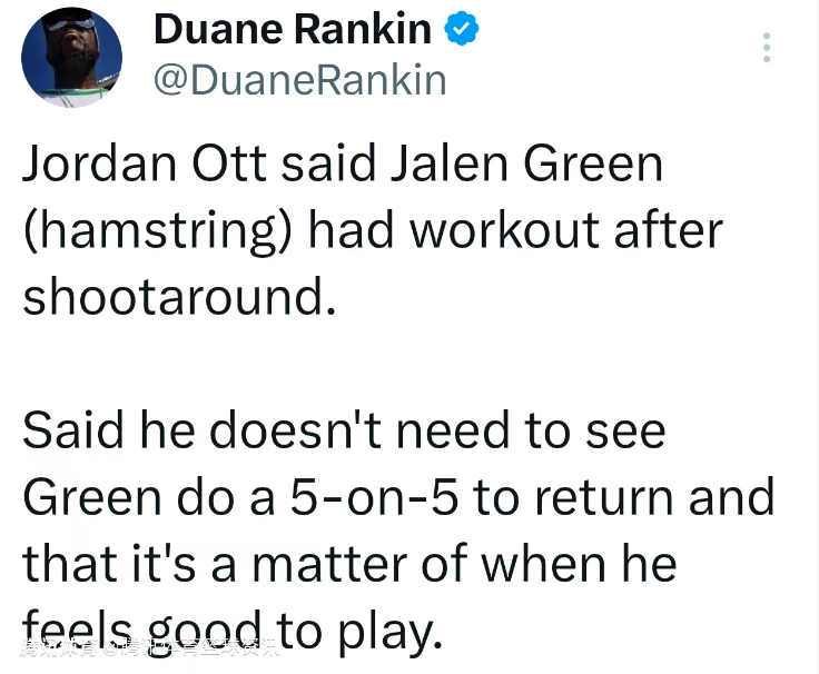 奥特表示,格林复出无需参加五对五对抗训练,只需等其身体感觉无碍便可出战。此前,奥特表示格林已接受核磁共振检查,显示右腿筋伤势无新情况出现,处于每日观察状态。