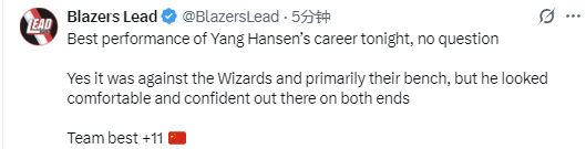 北京时间1月28日,NBA常规赛继续进行,开拓者队111-115不敌奇才队。杨瀚森此役6投2中得到6分5篮板1助攻,在场正负值+11全队最高。赛后,开拓者媒体Blazers Lead发文点赞了杨瀚森的表现。