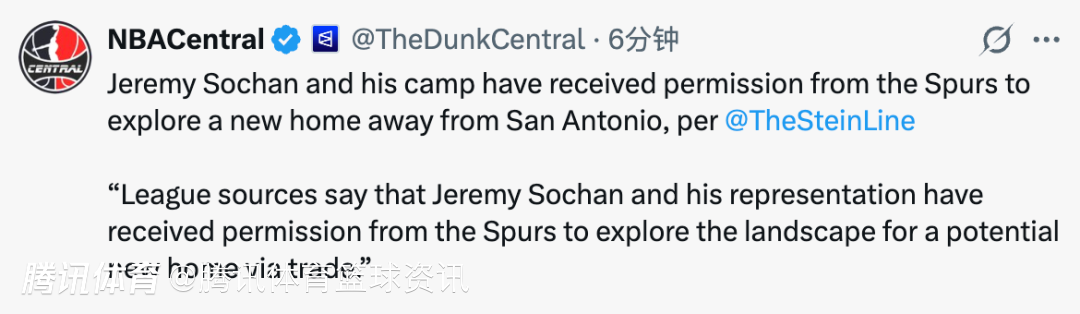 北京时间1月28日,据名记Stein报道,索汉及其团队已得到马刺队许可,可以为他探索离队、寻找新东家的可能性。