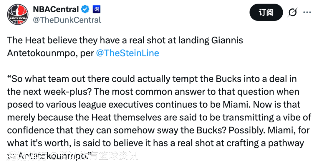Stein表示:“那么,未来一周多时间里,哪支球队能真正说服雄鹿队达成交易?向多位联盟高管提出这个问题后,最普遍的答案依然是迈阿密热火。这仅仅是因为热火方面一直传递出一种自信,认为他们有办法说服雄鹿队吗?或许是,值得一提的是,迈阿密方面确实相信,他们有切实的机会找到得到阿德托昆博的途径。”