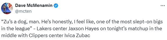 北京时间12月21日,湖人球员海斯在球队训练结束后接受媒体采访,谈及快船中锋祖巴茨的表现。