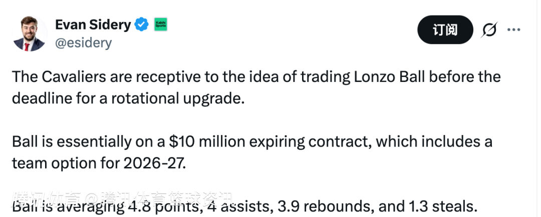 北京时间1月28日,据美记Evan Sidery报道,骑士愿意在交易截止日前送走朗佐-鲍尔,以换取球队轮换阵容的升级。