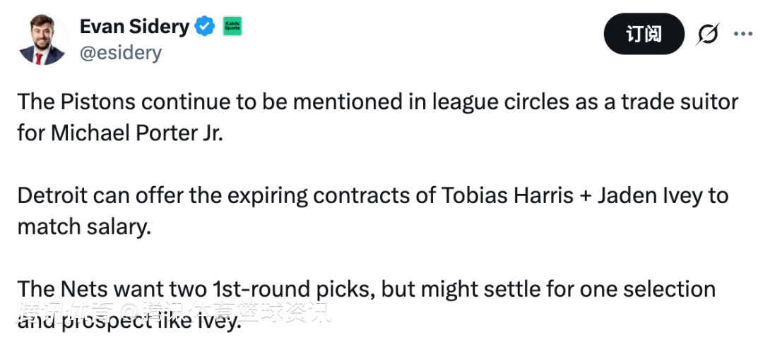 北京时间1月28日,据美记Evan Sidery报道,在联盟内部的交易讨论中,活塞队仍被频繁提及为小迈克尔-波特的潜在下家。
