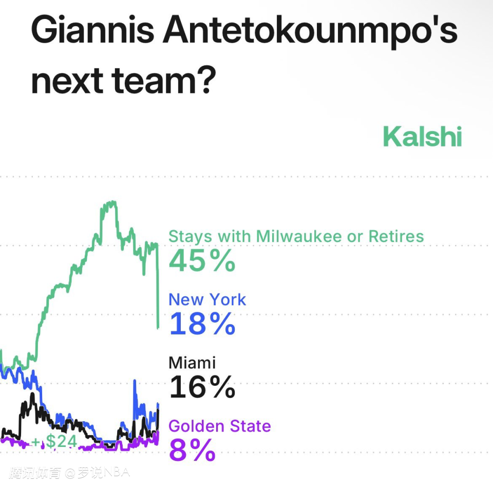 外媒Kaishi显示,字母哥留队概率降至45%,也就是说他离队的概率已经达到55%,其中,尼克斯获得字母哥的概率是18%,热火是16%,勇士8%。