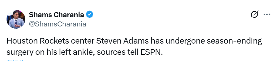 北京时间1月29日,据ESPN记者Shams报道,火箭队中锋史蒂文-亚当斯因左脚踝伤势接受手术,将缺席2025-26赛季剩余全部比赛。