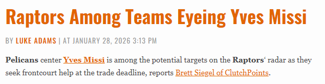 北京时间1月29日,据ClutchPoints记者布雷特-西格尔报道,鹈鹕队中锋米西已进入猛龙队的引援视野,成为球队在交易截止日前补强内线的潜在目标之一。