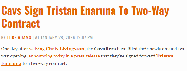 北京时间1月29日,在裁掉克里斯-利文斯顿的次日,骑士队便填补了队内双向合同的空缺,球队今日发布官方声明,宣布签下前锋特里斯坦-埃纳鲁纳,双方达成一份双向合同。