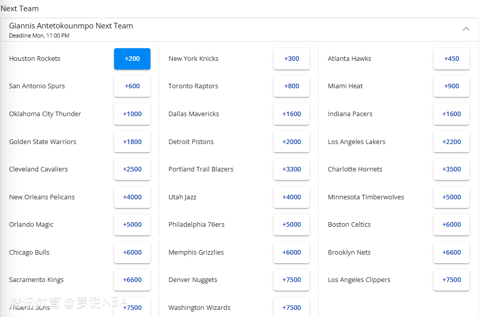 此前有报道称,字母哥心仪的三支球队是尼克斯、热火和森林狼。在赔率榜上,尼克斯排名第2,热火排名第6,而森林狼只排在第18。字母哥并没有交易否决权,所以他的去向也不完全掌控在自己手中。虽然名记MacMahon报道称火箭不会参与字母争夺战,但火箭还是排在赔率榜的第一,这无疑令人关注。