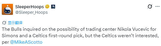 北京时间1月29日,据记者Mike Scotto报道,公牛队曾询价探讨过一笔交易的可能性,用中锋武切维奇换取西蒙斯以及凯尔特人队的一个首轮签,但凯尔特人方面对此并无兴趣。