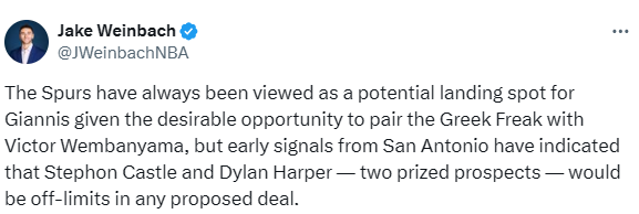 北京时间1月29日,据记者Jake Weinbach报道,外界一直认为马刺是字母哥的潜在下家,毕竟球队拥有将这位希腊怪兽与文班亚马搭档的绝佳机会,但圣安东尼奥方面的早期信号显示,卡斯尔和迪伦-哈珀这两位球队重点培养的新星,会被列为任何交易提案中的非卖品。