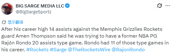 北京时间1月29日,火箭球星阿门-汤普森在球队训练结束后,谈及他在对阵灰熊的比赛中,送出职业生涯新高14次助攻的表现。阿门表示,他此役本想冲击前NBA控卫隆多那般单场20次助攻的表现。隆多职业生涯中共11次打出单场20+助攻的比赛。