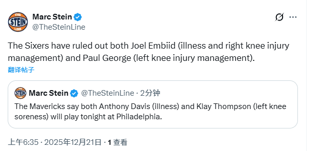 北京时间12月21日,NBA常规赛继续进行,76人对阵独行侠。赛前,两支球队分别公布本场比赛最新伤情。