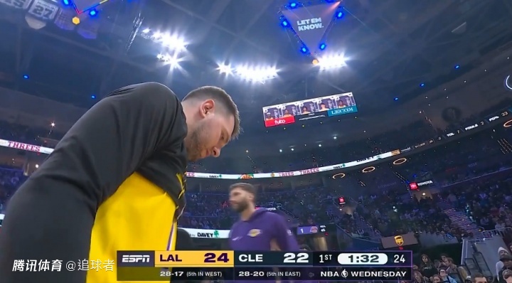 东契奇被骑士球场的无脑设计坑惨了,第一节打到7分55秒,东契奇尝试三分打铁不中,之后单脚一直后退,结果直接从球场上掉了下去;由于骑士主场地板与看台之间有台阶,东契奇踩空了,意外扭伤脚踝,痛苦倒地不起,湖人喊停比赛后,詹姆斯第一时间走过去,十分担心卢卡的伤情,之后东契奇一瘸一拐离场,返回更衣室接受检查。
