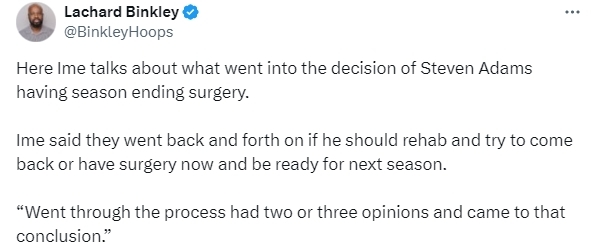 根据火箭官方此前公布的消息,亚当斯已成功接受左脚踝手术,预计将完全康复,将缺席本剩余的所有比赛。在谈到为何亚当斯选择手术治疗时,乌度卡表示:“没人能立即判断出他遭遇了严重扭伤,第二天接受检查时,只是发现没有骨折,但肿胀依然很大。当时初步诊断为三级严重扭伤,并确认存在韧带损伤。亚当斯之后咨询了几位医生,在是否要立即进行手术方面反复斟酌,他经过了整套流程,综合了两三种意见后,最终得出了这一结论(接受手术)。”