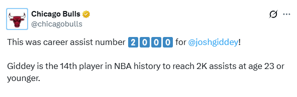 比赛进行过程中,吉迪送出本场第5次助攻,生涯助攻总数就此达到2000次。根据公牛官方统计,吉迪也成为NBA历史上第14位在23岁及以下达成2000次助攻里程碑的球员。