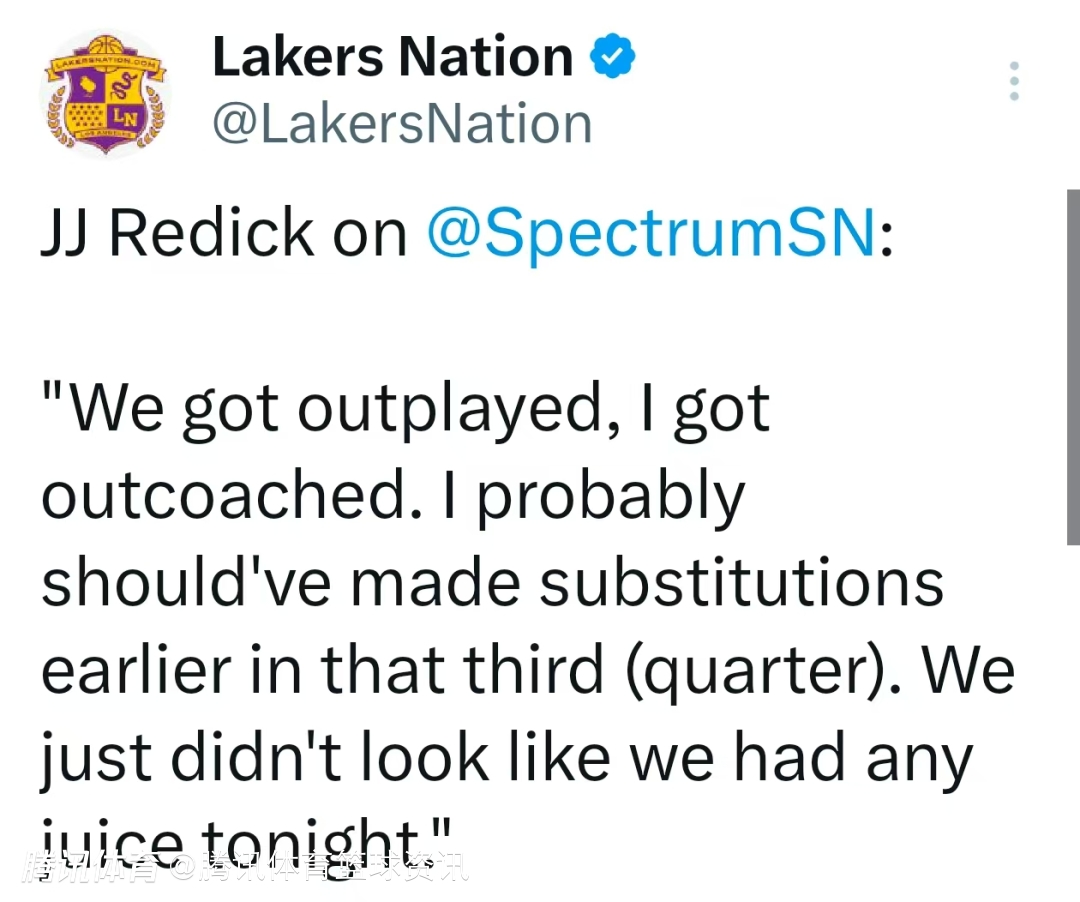 关于本场失利,雷迪克表示:“我们整场被对手压制,我的执教也完败。第三节我本应该更早做出换人调整的,今晚球队看着就毫无斗志。”