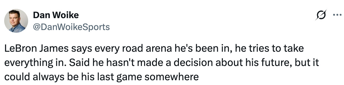 被问到这是不是他最后一次在骑士主场打球,詹姆斯表示:“有可能。我还没有为未来做出决定……这完全有可能。” 此外,他也表示自己尚未考虑过告别巡演,因为他目前还没有与自己和家人正式讨论过退役,他坦言相关计划会在未来决定。他说道:“如果8年前我刚去洛杉矶时,你问我2026年是否还在打球,我可能会说不会。我只是专注于当下,不确定这是否会是我在这里的最后一场比赛。”