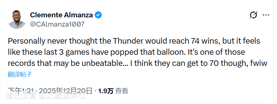 雷霆记者Clemente Almanza发推写道:“我个人从没想过雷霆队能拿到74胜,但感觉最近这三场比赛彻底戳破了这个幻想,这或许是那种永远无法打破的纪录……不过我觉得他们最终还是能拿到70胜的。”历史上此前只有勇士(73-9)和公牛(72-10)拿过70胜。