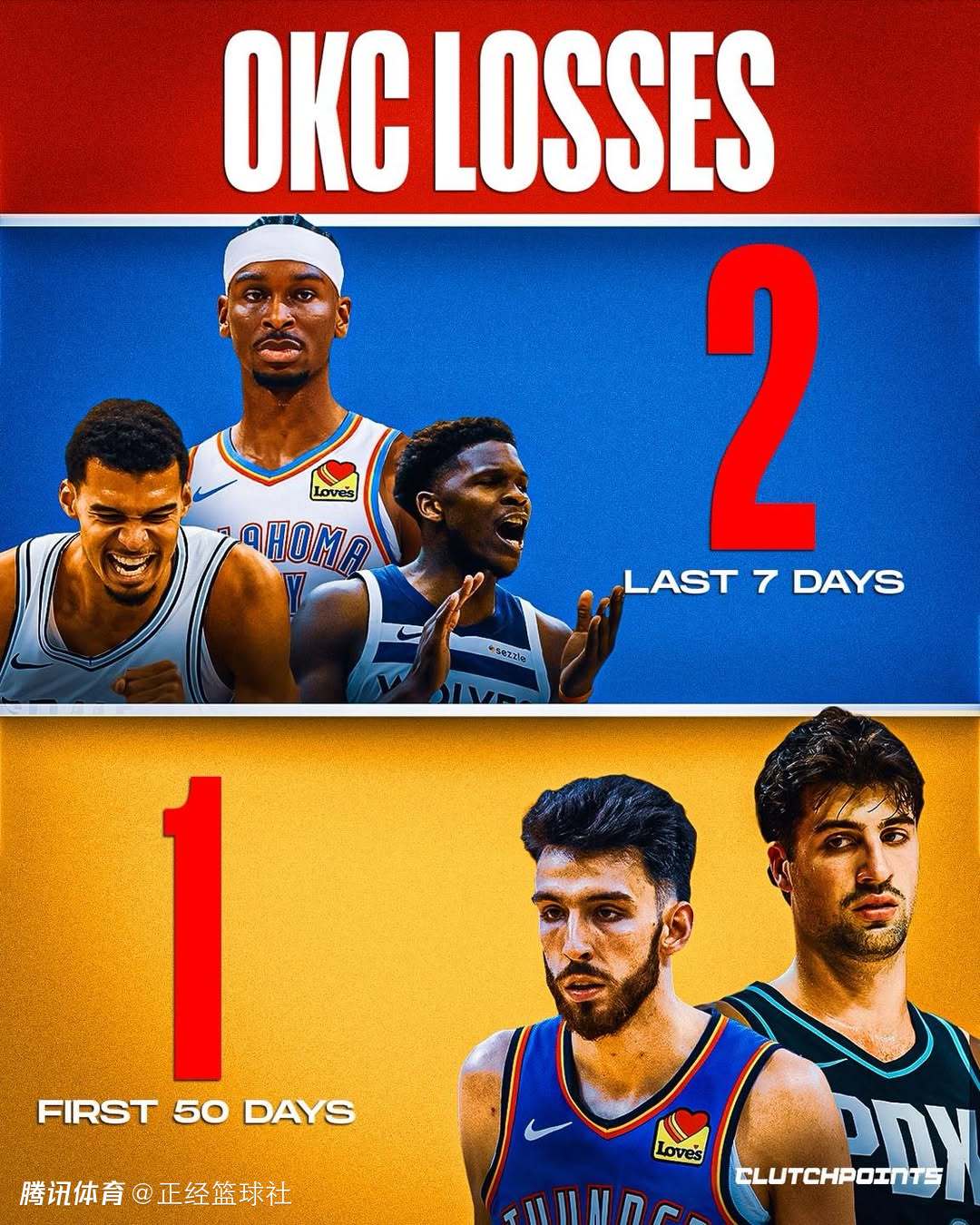 美媒ClutchPoints发文提到雷霆在过去的一周输了两场比赛,而在这之前雷霆用了50天才输掉第一场比赛。文中说道人们会因此反应强烈,但从更大的层面看,一切并没有改变。赛程变得更密集了,对抗更激烈了,而且雷霆正在把杰伦-威廉姆斯重新融入一支在他缺阵时运转得非常顺的阵容里,这种调整必然会伴随一些不适应。