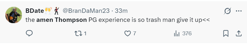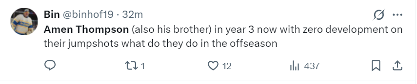 火蜜:阿门-汤普森在进攻方面太没用了。他完全破坏了球的运转节奏,因为他在球场上的任何位置都不具备威胁性,只有在篮下才有威胁。