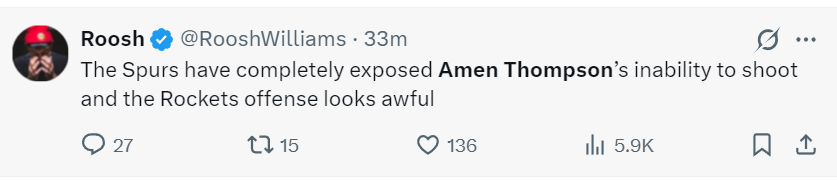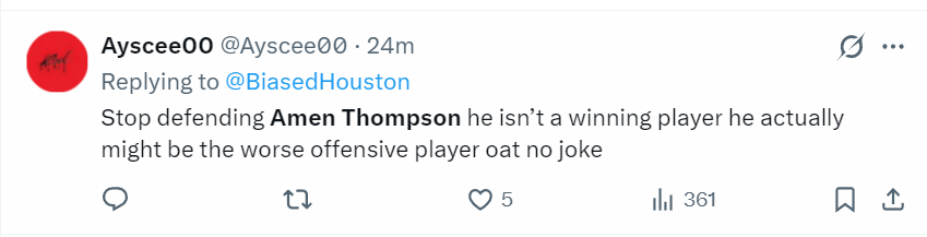 此役阿门-汤普森全场比赛36分钟,23中11,罚球3中3,拿到火箭最高的25分外加7分4篮板4抢断1盖帽,命中率47.8%,整个第四节7中1拿2分,他出手是火箭最多。