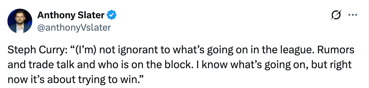 记者问道:“你现在是否更愿意去谈论球队更宏观的未来规划,而不只是眼下的比赛任务?”库里表示:“并没有,我认为我们的工作就是继续赢下比赛,尽我们所能保持专注,投入我们的精力。那些围绕球队的流言、球员被卷入交易传闻的种种消息,都属于无关的干扰。我不会把精力浪费在这些事情上,这不是我的工作。”