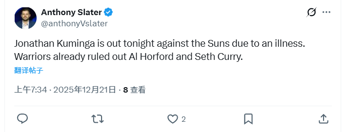 库明加因生病缺战,除此之外,勇士此前已官宣霍福德、塞斯-库里双双无缘出战本场比赛。