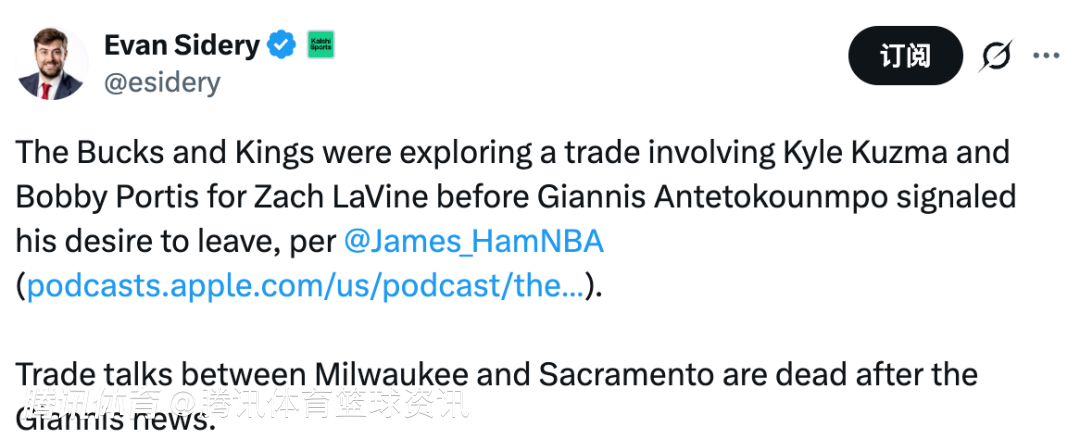 但在扬尼斯的离队消息公布后,雄鹿与国王之间的这笔交易谈判已经彻底终止。稍早前,据名记Scotto报道,雄鹿已在全联盟范围内评估了库兹马和波蒂斯的交易价值。