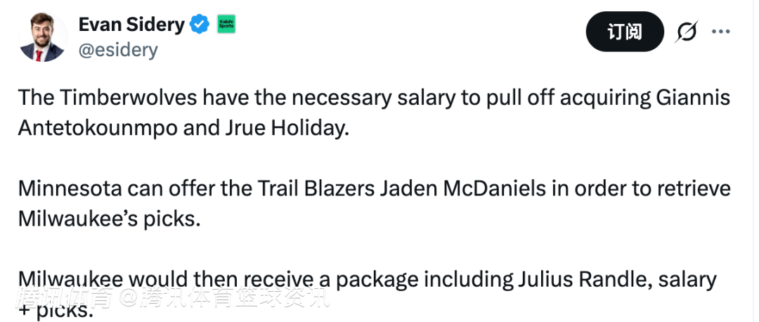 北京时间1月29日,据美记Evan Sidery报道,森林狼拥有足够的薪资空间,能够完成对字母哥和朱-霍勒迪的交易。