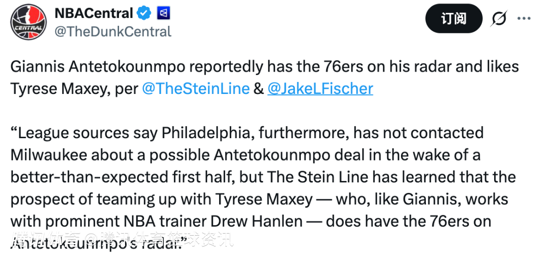 北京时间1月30日,据名记Stein和Jake Fischer联合报道,字母哥已将76人纳入考虑范围,并且十分欣赏马克西。