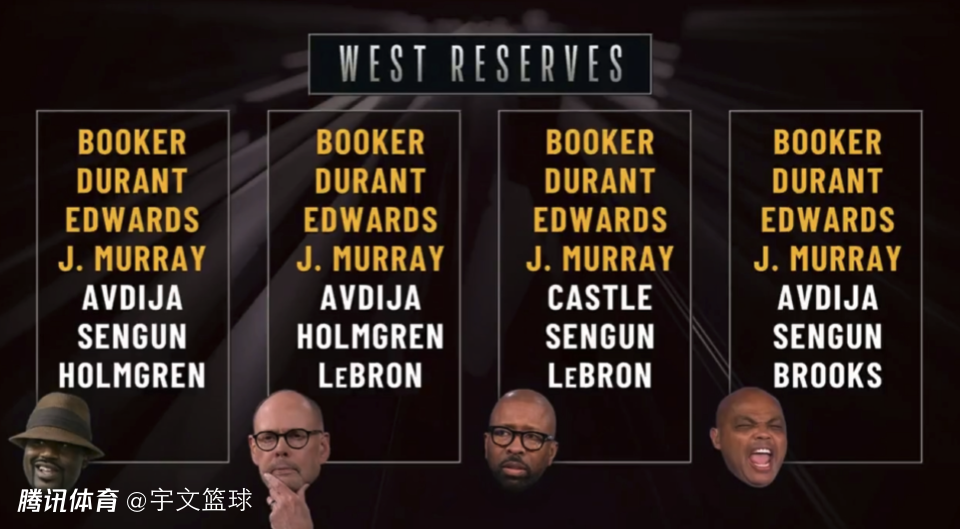 西部方面,四人一致认可入选的有四人,分别是布克(太阳)、杜兰特(火箭)、爱德华兹(森林狼)和贾马尔-穆雷(掘金)。除此以外,上榜的球员还有开拓者的阿夫迪亚(3票),火箭的申京(3票),雷霆的霍姆格伦(2票),湖人的詹姆斯(2票),马刺的卡斯尔(1票),太阳的狄龙-布鲁克斯(1票)。