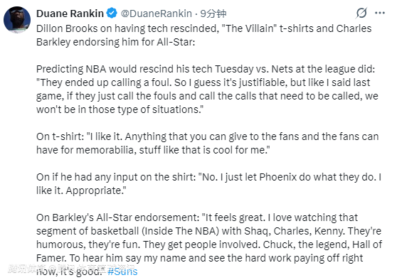 北京时间1月30日,太阳球星狄龙-布鲁克斯在球队训练结束后接受媒体采访,谈及技术犯规被撤销、“反派”主题T恤以及巴克利为其全明星拉票等话题。