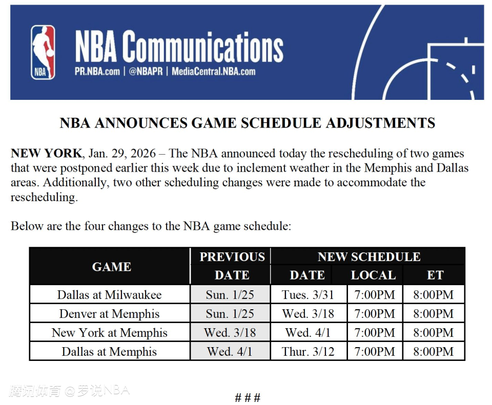 受赛程调整影响,NBA同时更改了另外两场涉及独行侠、灰熊和尼克斯的比赛日期,具体变动如下: