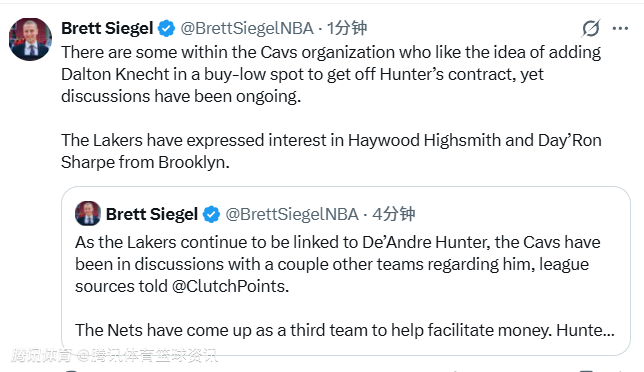 北京时间1月30日,据记者Brett Siegel报道,联盟消息人士向ClutchPoints透露,湖人持续与德安德烈-亨特传出绯闻的同时,骑士也正和其他几支球队商谈关于亨特的交易。