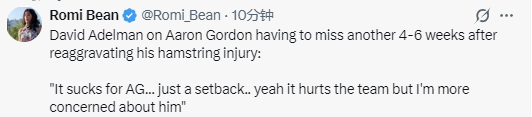 戈登因腿筋伤势复发需要再缺阵4-6周,谈到此事时,阿德尔曼表示:“首先这太让人糟心了。他刚伤愈归来,一路熬完康复训练,他的回归本让我们的比赛状态回升不少,球队也找回了熟悉的比赛节奏,可现在一切又倒退了一步。没办法,只能重新开启整个康复流程,他自己也憋着一股劲想尽快归队打比赛,偏偏遇上这种事,这个赛季实在太不顺了,真的太遗憾了,球队的冲刺势头又一次被打断。”