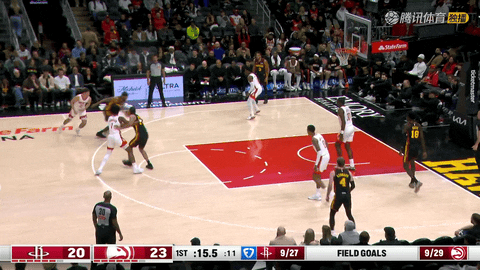 节末火箭在防守端限制住老鹰得分,进攻端第一节还剩27秒时阿门突破挑篮命中,紧接着在还剩6秒时霍勒迪接阿门分球命中三分,首节结束双方战成23:23。