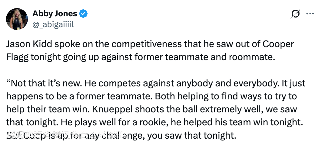 谈及弗拉格和克努佩尔的对位,基德表示:“这其实并不新鲜。他向来会和任何对手全力竞争,今晚只是恰好对上了前队友而已。两人都在想办法帮助各自的球队赢球。克努佩尔的投篮能力极强,今晚我们已经见识到了;作为一名新秀,他表现得非常出色,也确实帮助球队拿下了胜利。但库珀从不畏惧任何挑战,今晚你也看到了这一点。”