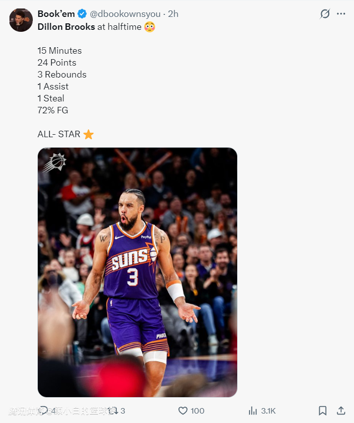 这场比赛的狄龙就如同布克附体一般,他首节6中3+三分2中1拿到9分1篮板1助攻1抢断,次节更是5中5+三分1中1+罚球4中4拿到15分(除了罚球都是投篮),半场狄龙15分钟以72%的命中率拿到24分。