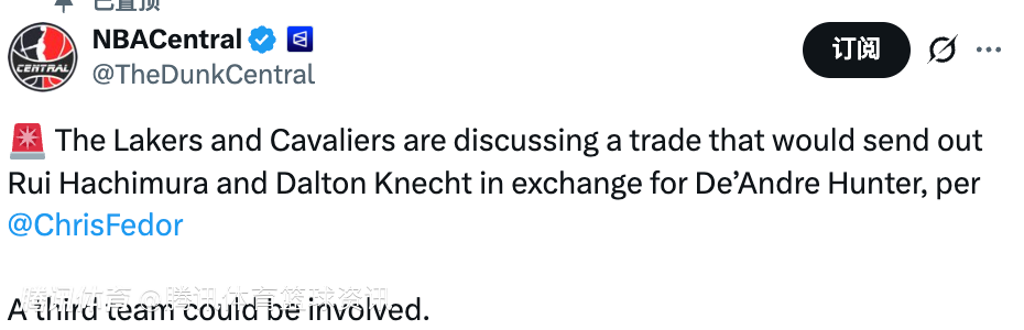 北京时间1月30日,据骑士队记Chris Fedor报道,湖人队与骑士队正在商讨一笔交易,湖人将送出八村垒和克内克特,以换取德安德烈-亨特,这笔交易也可能会有第三方球队参与。