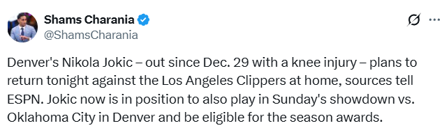 按照Shams本周早些时候给出的时间线,约基奇本会错过本周末对阵快船与雷霆的两场分区内战,且若连续缺席第17和18场比赛,他将因达不到至少出战65场的硬性要求,失去角逐赛季末各项奖项的资格。但如今他不仅有望出战对阵快船和雷霆的两场主场赛事,暂时保留了奖项评选资格——只要在本赛季剩余赛程中不再缺阵,约基奇的赛季出战次数就能达到66场。