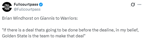 Brian Windhorst表示,如果在交易截止日期前能达成交易,金州勇士队是最有可能达成(字母哥)这笔交易的球队。