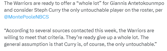 勇士猛烈追求字母哥,勇士记者Monte Poole报道,勇士在围绕字母哥的潜在交易讨论中,愿意提供大量筹码,库里被视为勇士队内唯一的非卖品;多位消息人士透露,勇士愿意满足雄鹿报价条件,并已做好在交易谈判中付出较多资产的准备。