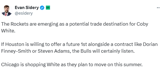 Sidery表示,如果火箭愿意送出一枚未来首轮签,再搭配芬尼-史密斯或亚当斯这样的合同,公牛队肯定会认真考虑。