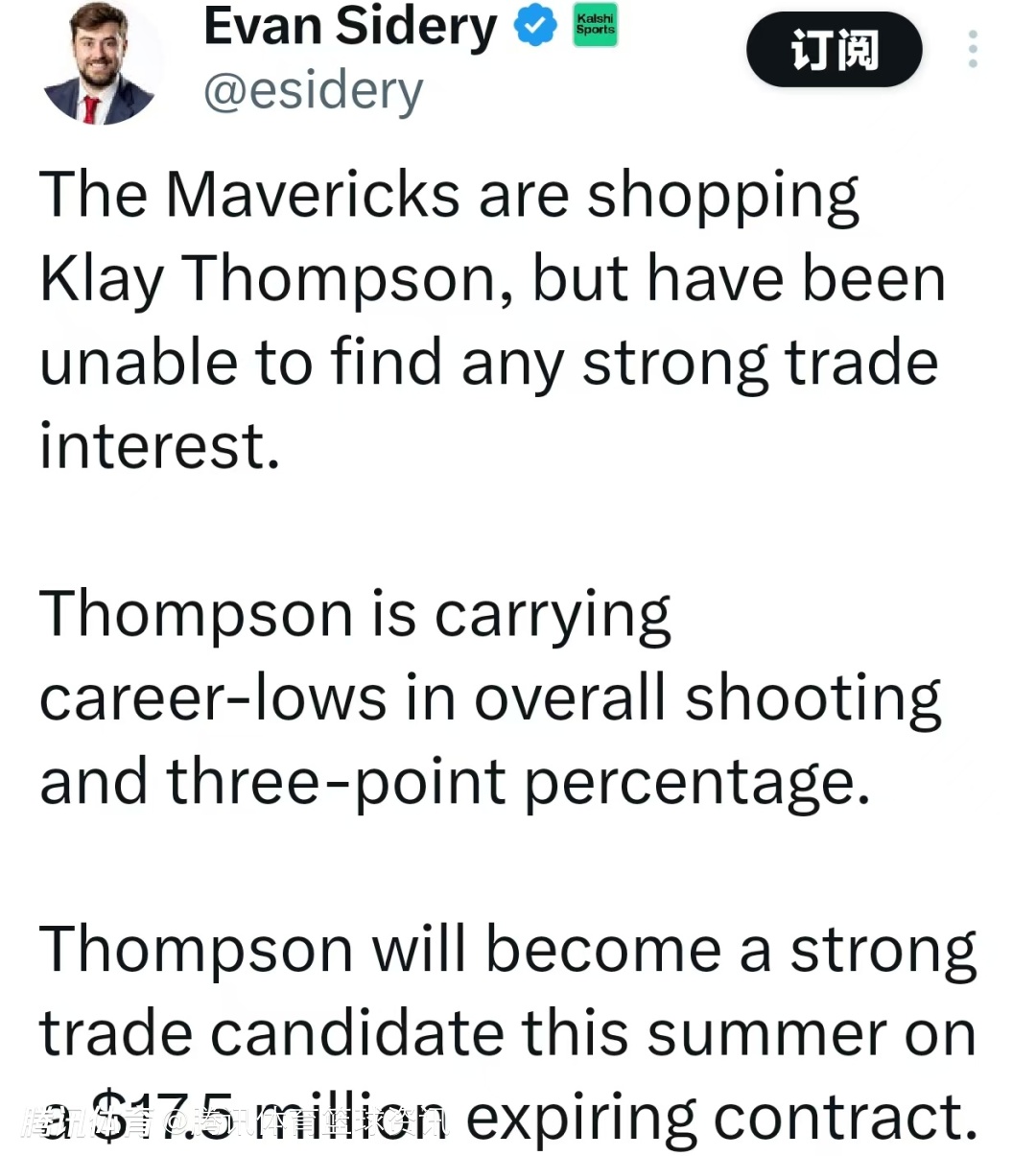 北京时间1月31日,据记者Evan Sidery报道,独行侠正兜售克莱-汤普森,但目前尚未收到任何实质性的交易意向。