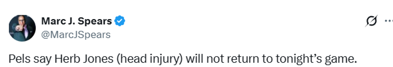 北京时间12月21日,NBA常规赛,鹈鹕主场对阵步行者,赫伯特-琼斯在第二节伤退,鹈鹕官方宣布,他因为头部受伤,本场比赛不会回归。
