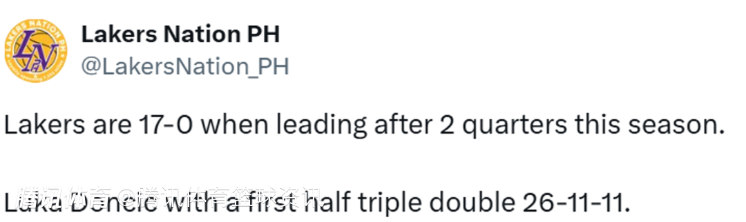 北京时间1月31日,NBA常规赛,湖人对阵奇才,上半场战罢,湖人以77-48大幅领先,东契奇交出三双数据。值得一提的是,湖人半场领先时,球队本赛季取得17胜0负的佳绩。