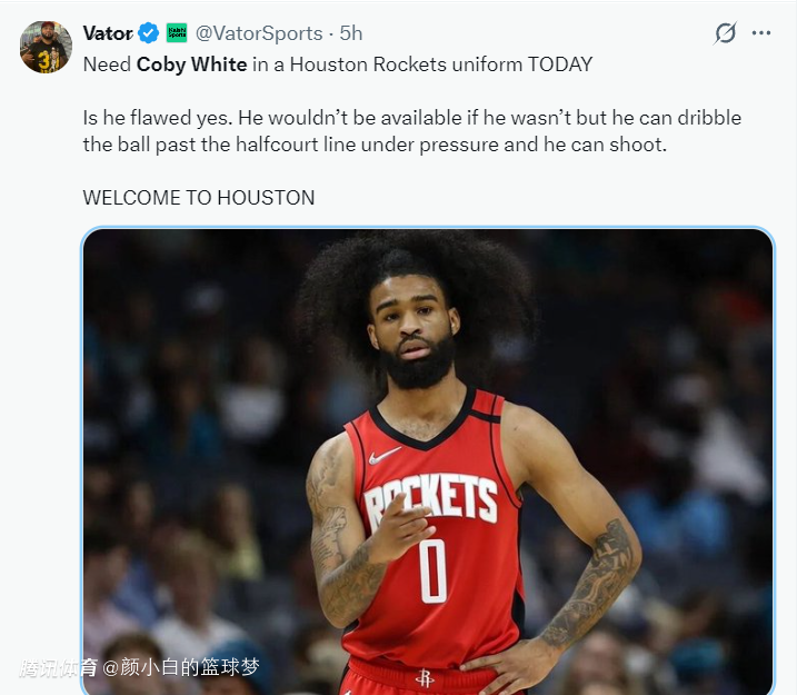 休媒Bradeaux则直言:不管怀特的交易是否发生,我都不希望是跟休斯顿扯上关系。他在评论区与球迷的互动明确表态怀特根本不契合火箭的体系,怀特不是一个纯正的一号位球员而且不擅长防守。