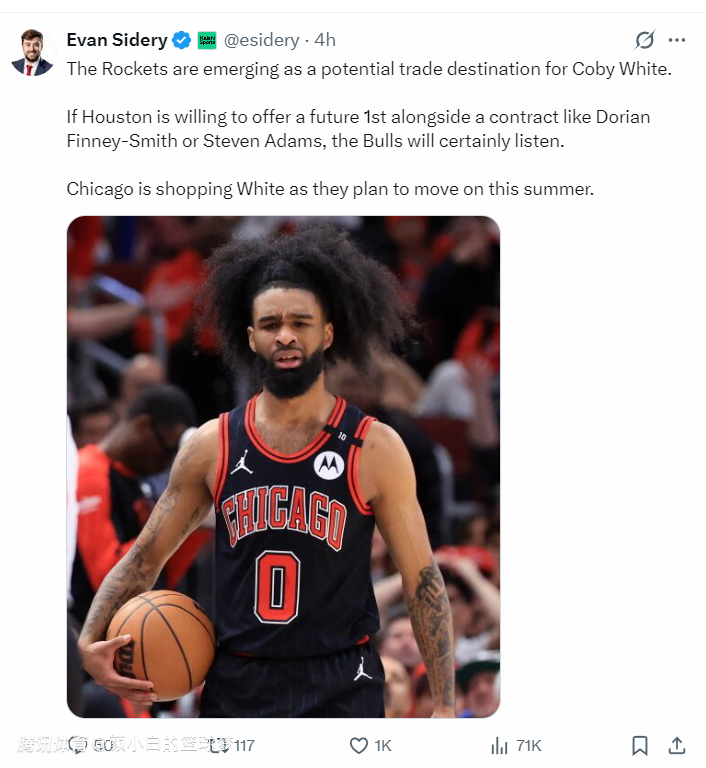 随后《福布斯体育》记者埃文-斯迪瑞报道,火箭已经成为科比-怀特的潜在交易下家,如果火箭队愿意提供一个首轮签,再加上芬尼-史密斯或者史蒂文-亚当斯这样的球员合同,那么公牛会考虑达成交易。