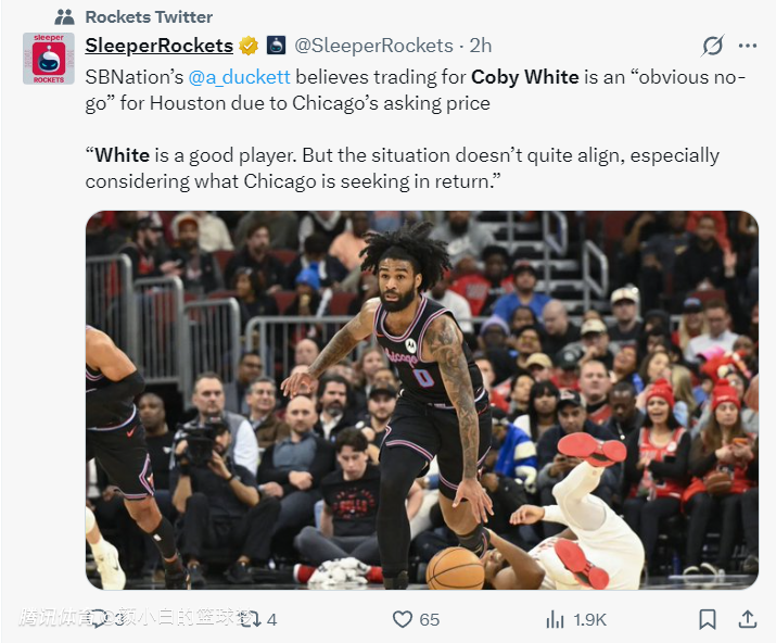 北京时间1月31日,美媒SBN记者也表示鉴于芝加哥公牛方面提出的要价,休斯顿引进怀特的交易显然是不可行的。怀特的确是一位出色的后卫,但目前他的情况不符合火箭预期,尤其考虑到公牛要求过高的回报。