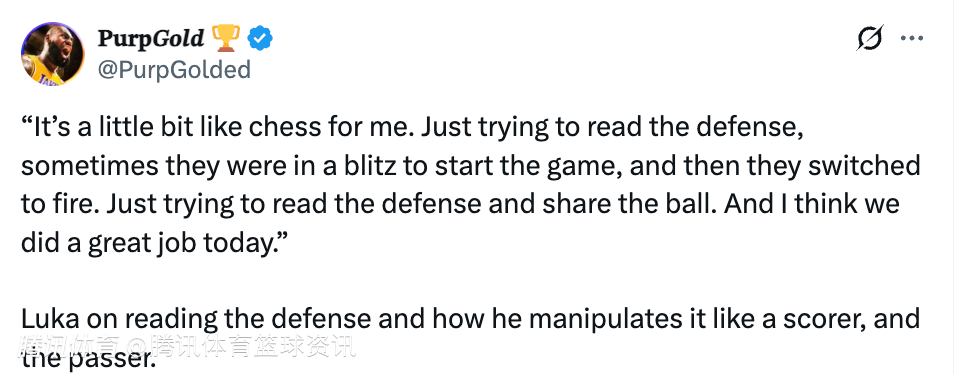 谈到如何阅读和掌控比赛,东契奇直言:“对我来说这有点像下棋,就是努力去阅读防守。有时候他们开场会用紧逼,之后又换成联防。我要做的就是判断防守,然后分享球。我觉得我们今天做得非常好。”